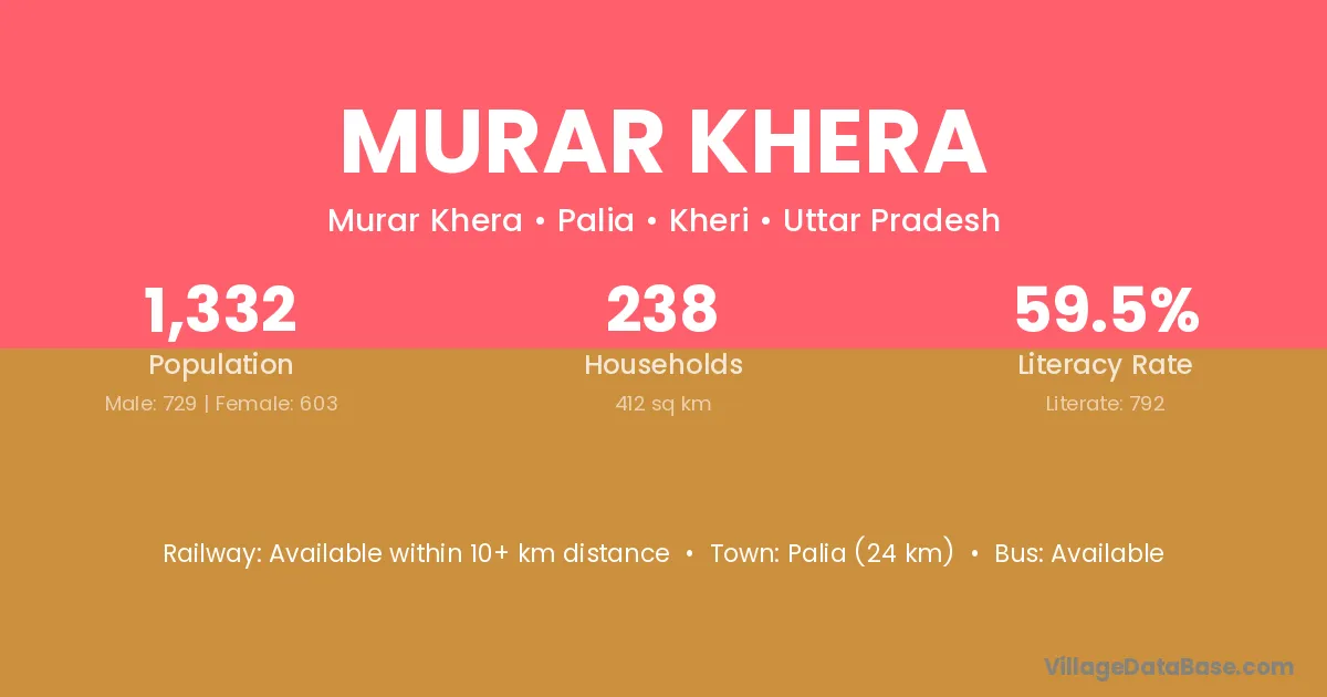 Palia (24 km) is the nearest town to Murar Khera village for major economic activities and is located approximately 24 km away.