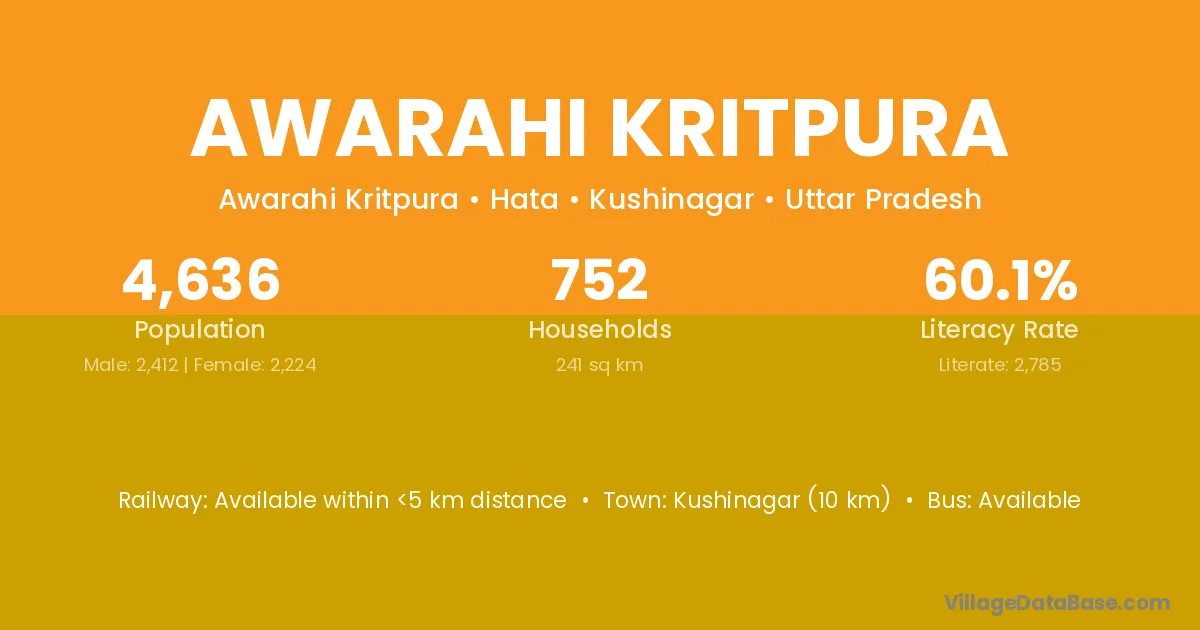 Kushinagar (10 km) is the nearest town to Awarahi Kritpura village for major economic activities and is located approximately 10 km away.