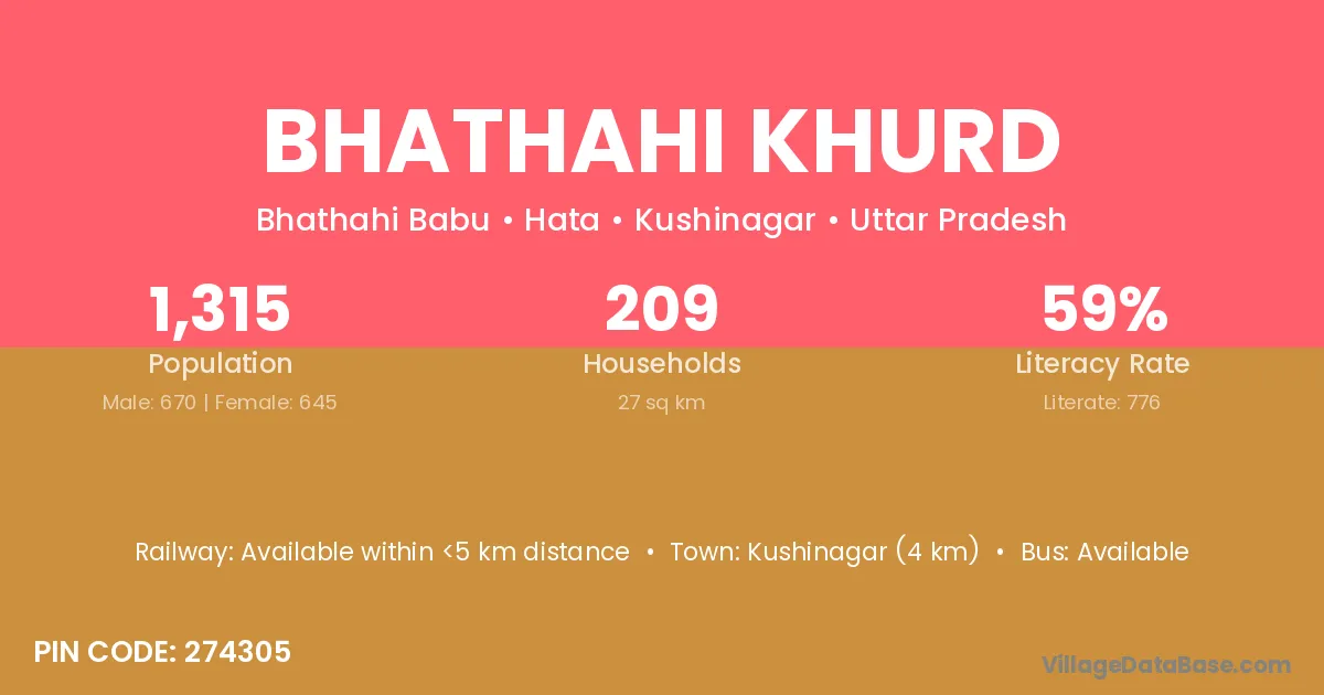 Kushinagar (4 km) is the nearest town to Bhathahi Khurd village for major economic activities and is located approximately 4 km away.