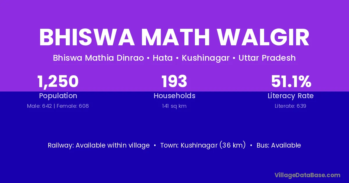 Kushinagar (36 km) is the nearest town to Bhiswa Math Walgir village for major economic activities and is located approximately 36 km away.
