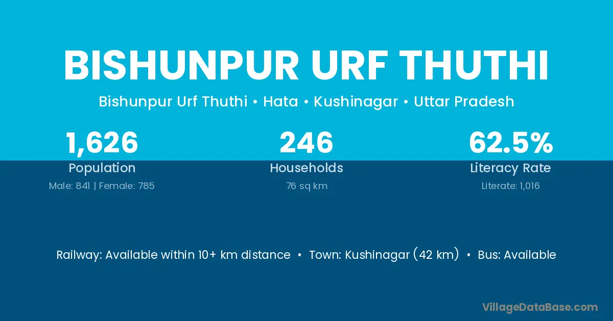 Kushinagar (42 km) is the nearest town to Bishunpur Urf Thuthi village for major economic activities and is located approximately 42 km away.