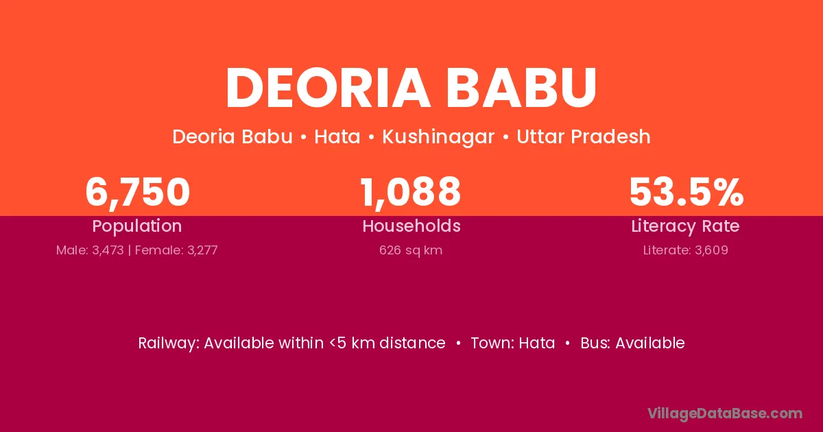Deoria Babu village has a total population of 6,750 people, of which 3,473 are males and 3,277 are females.