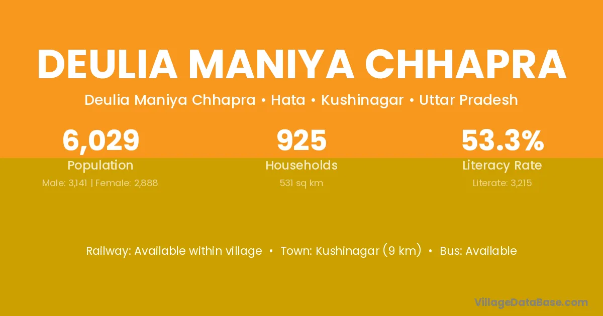 Kushinagar (9 km) is the nearest town to Deulia Maniya Chhapra village for major economic activities and is located approximately 9 km away.