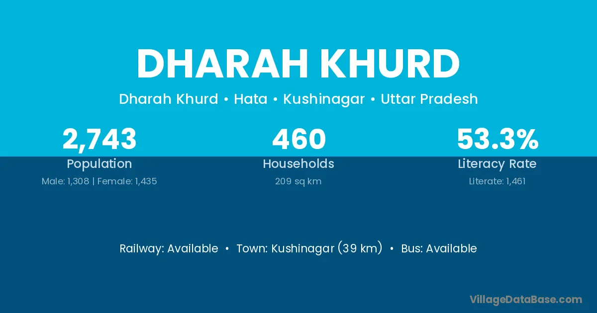 Kushinagar (39 km) is the nearest town to Dharah Khurd village for major economic activities and is located approximately 39 km away.