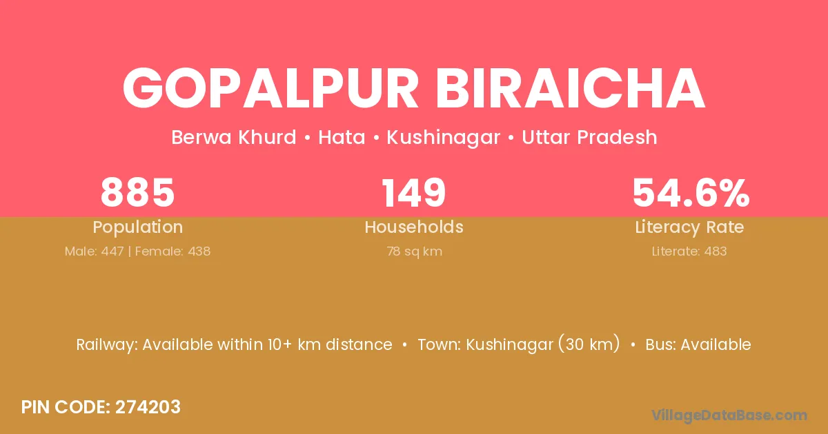 Kushinagar (30 km) is the nearest town to Gopalpur Biraicha village for major economic activities and is located approximately 30 km away.