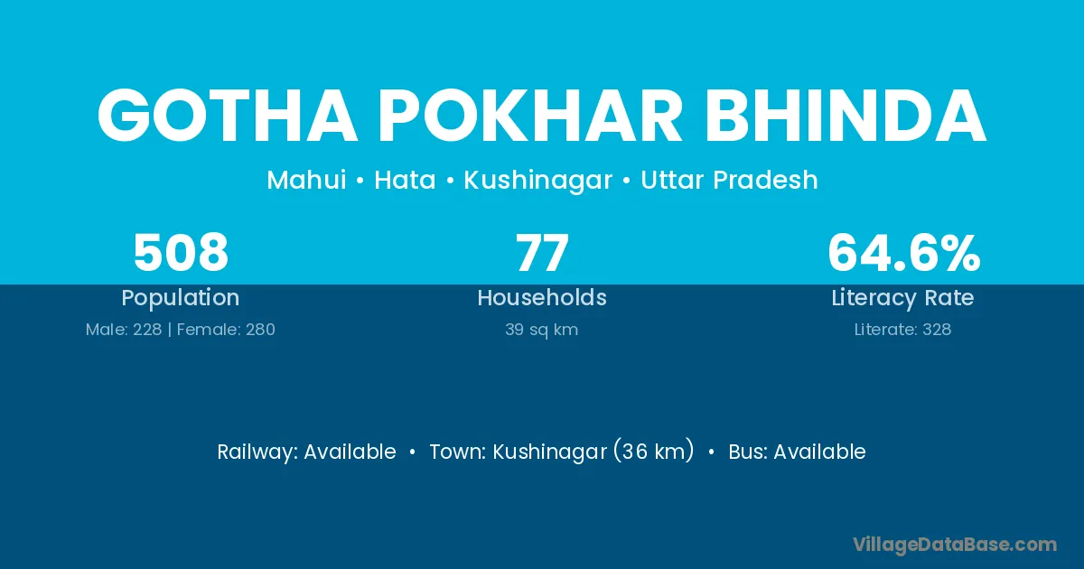 Kushinagar (36 km) is the nearest town to Gotha Pokhar Bhinda village for major economic activities and is located approximately 36 km away.