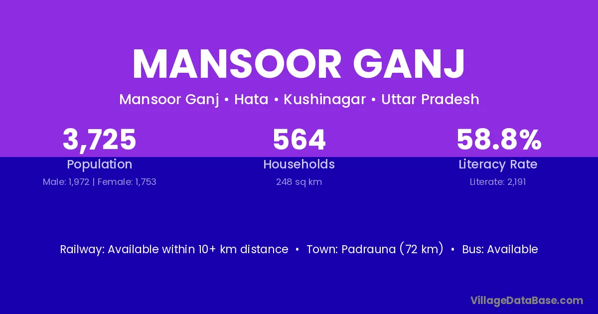 Padrauna (72 km) is the nearest town to Mansoor Ganj village for major economic activities and is located approximately 72 km away.
