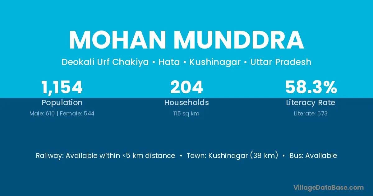 Kushinagar (38 km) is the nearest town to Mohan Munddra village for major economic activities and is located approximately 38 km away.