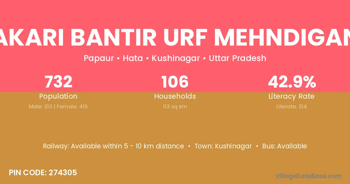 Pakari Bantir Urf Mehndiganj village has a total population of 732 people, of which 313 are males and 419 are females.