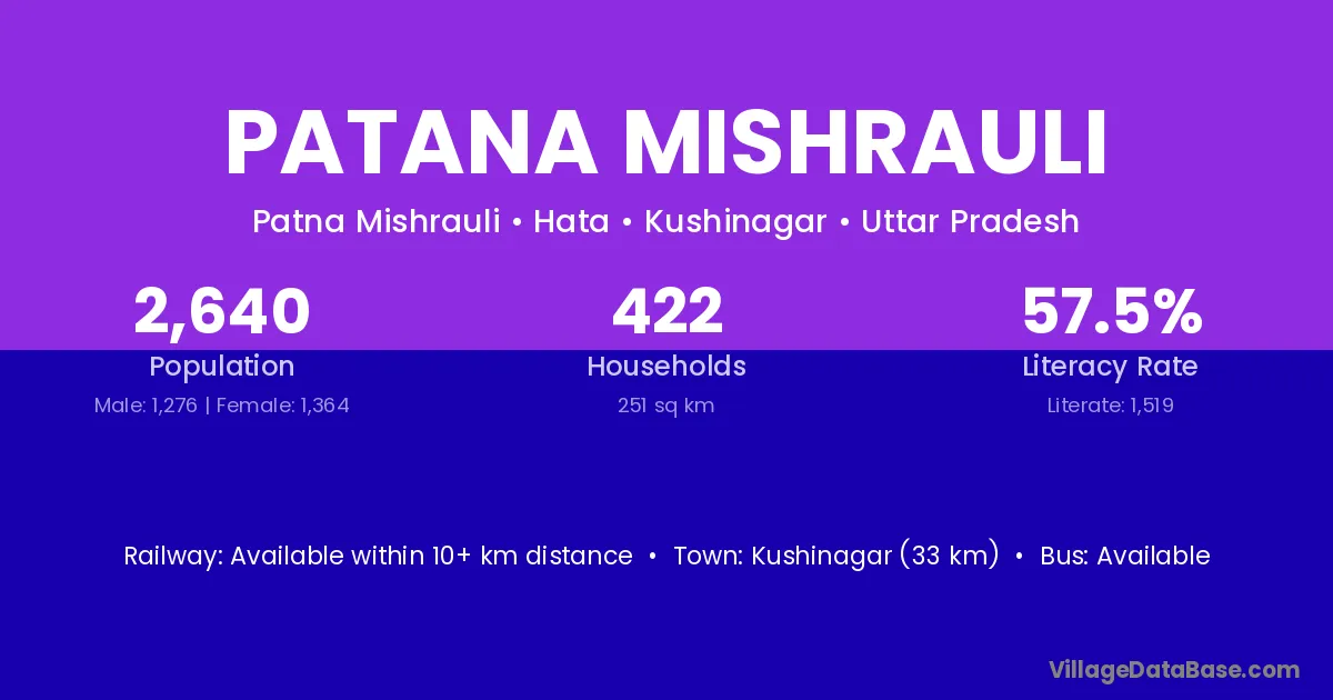 Kushinagar (33 km) is the nearest town to Patana Mishrauli village for major economic activities and is located approximately 33 km away.