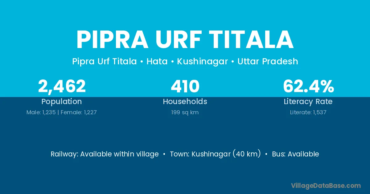 Kushinagar (40 km) is the nearest town to Pipra Urf Titala village for major economic activities and is located approximately 40 km away.