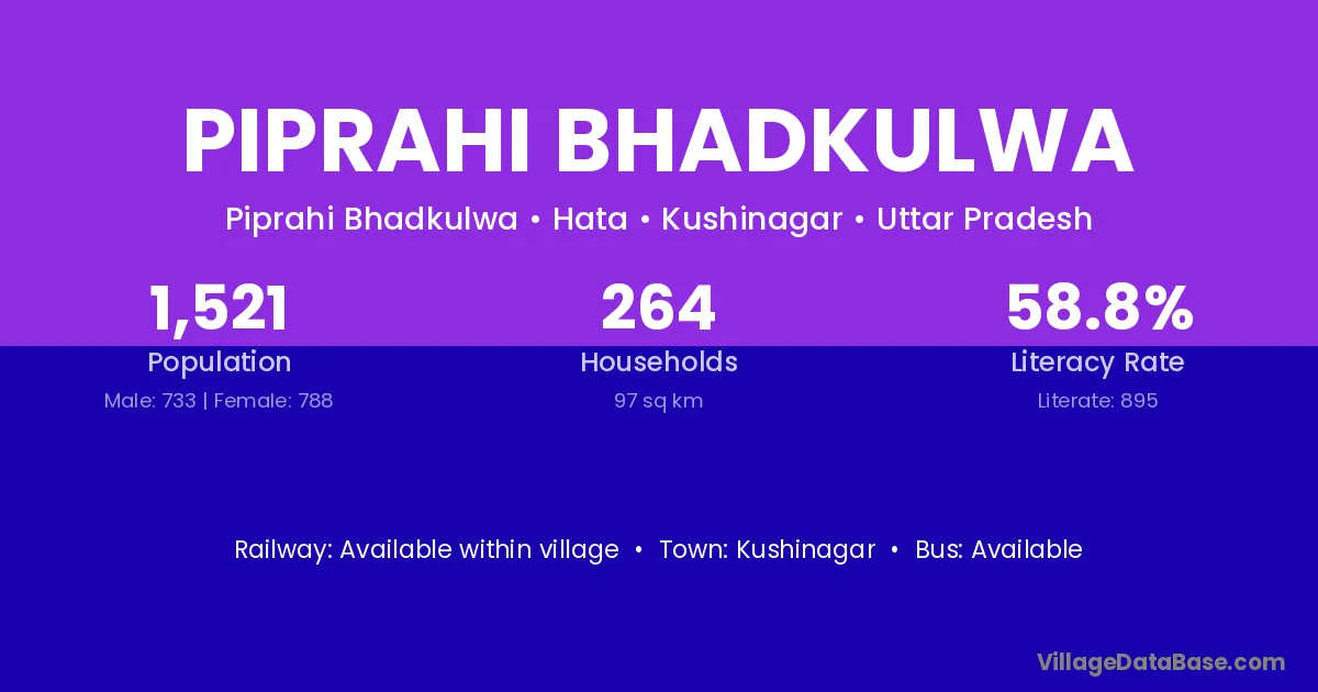 Piprahi Bhadkulwa village has a total population of 1,521 people, of which 733 are males and 788 are females.