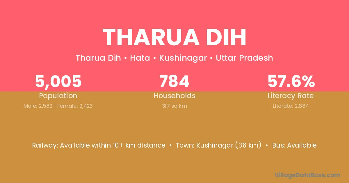 Kushinagar (36 km) is the nearest town to Tharua Dih village for major economic activities and is located approximately 36 km away.