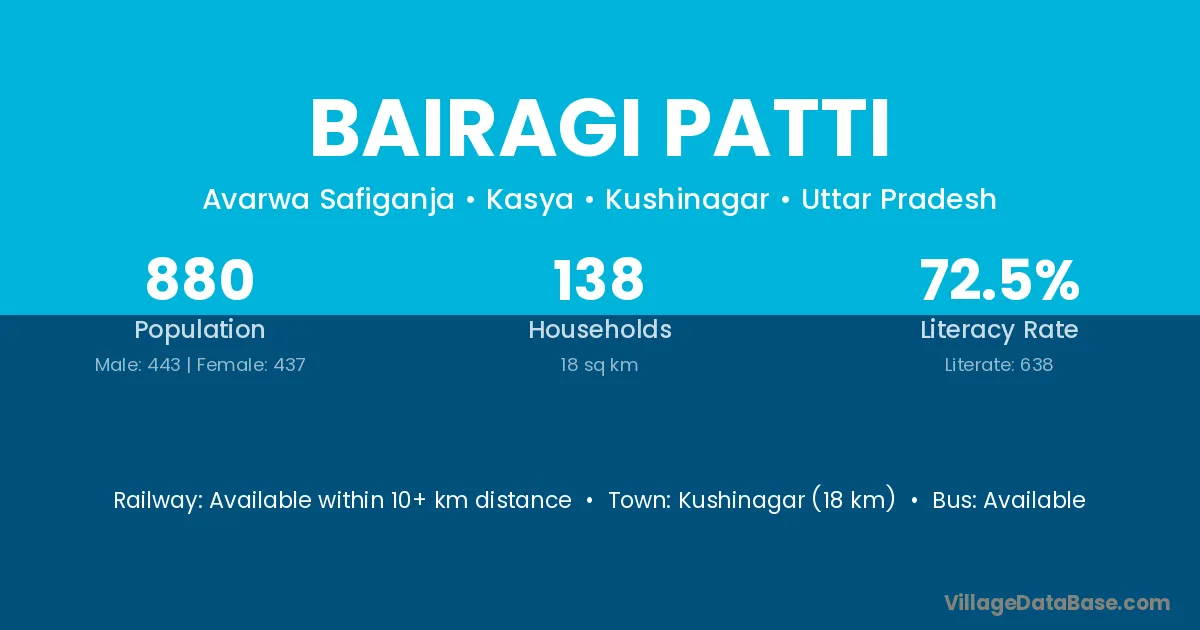 Kushinagar (18 km) is the nearest town to Bairagi Patti village for major economic activities and is located approximately 18 km away.