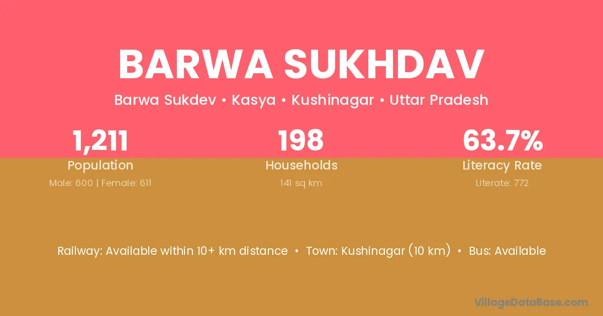 Barwa Sukhdav village has a total population of 1,211 people, of which 600 are males and 611 are females.