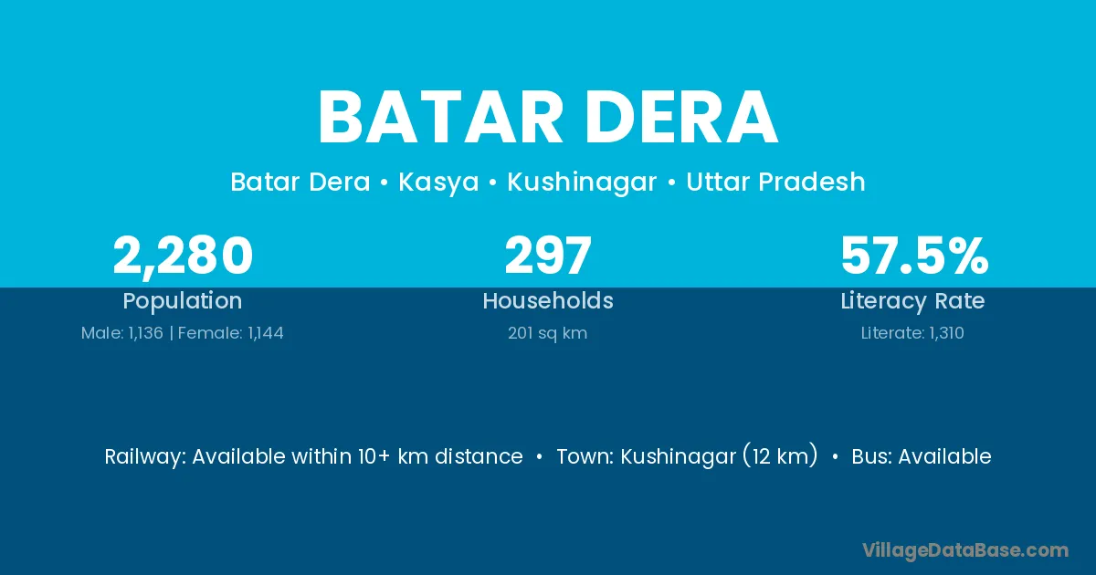 Kushinagar (12 km) is the nearest town to Batar Dera village for major economic activities and is located approximately 12 km away.