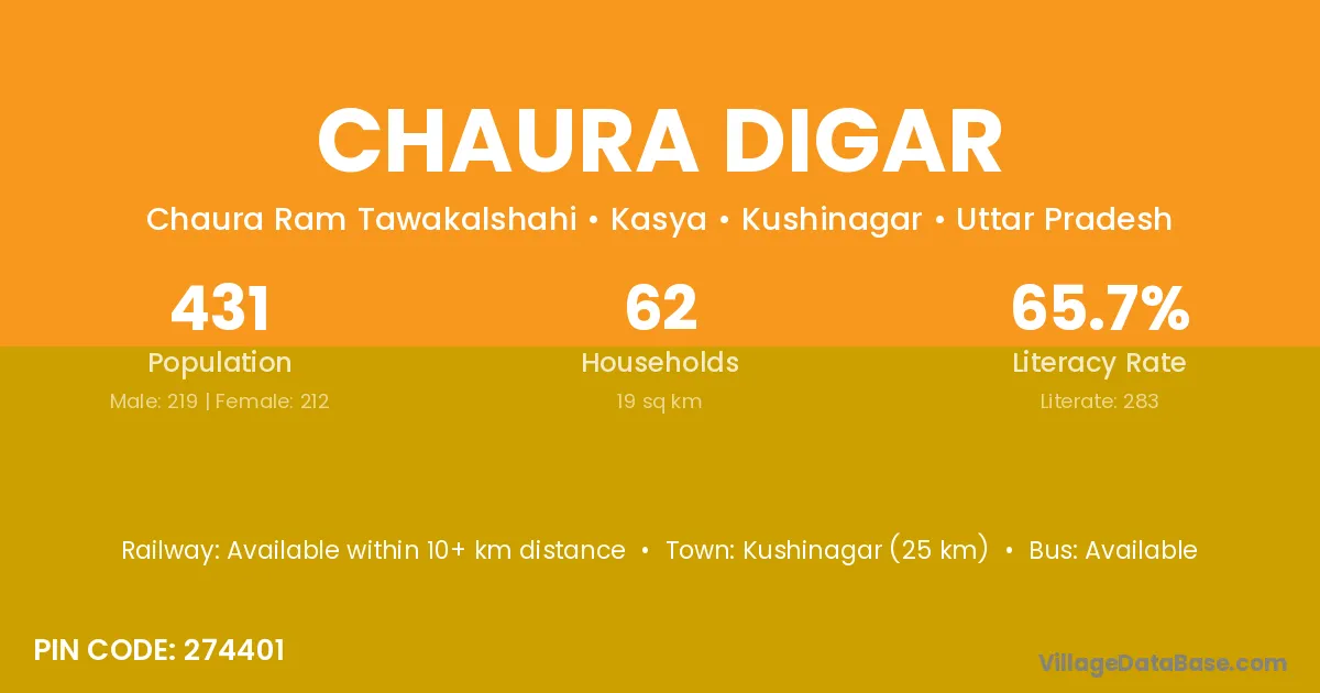 Kushinagar (25 km) is the nearest town to Chaura Digar village for major economic activities and is located approximately 25 km away.