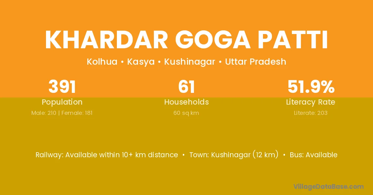 Kushinagar (12 km) is the nearest town to Khardar Goga Patti village for major economic activities and is located approximately 12 km away.
