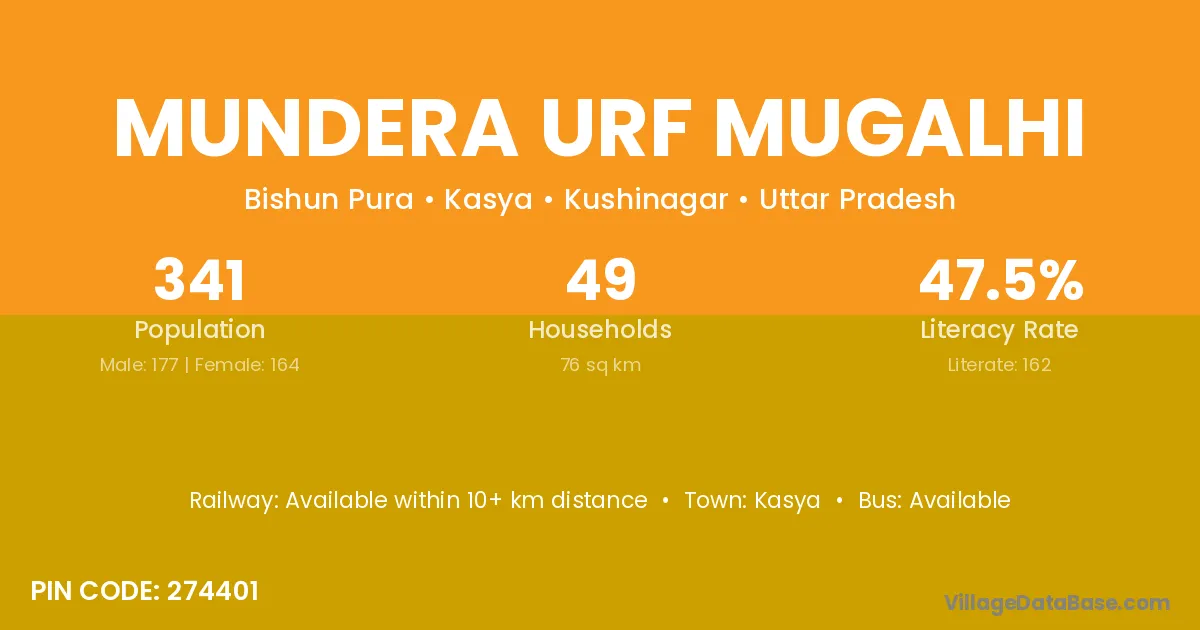 Mundera Urf Mugalhi village has a total population of 341 people, of which 177 are males and 164 are females.