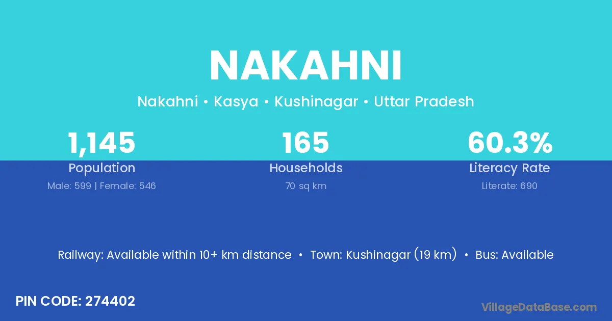 Kushinagar (19 km) is the nearest town to Nakahni village for major economic activities and is located approximately 19 km away.