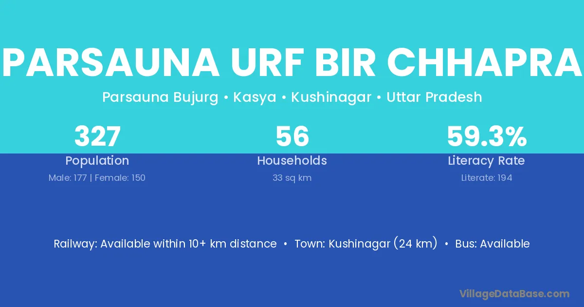 Kushinagar (24 km) is the nearest town to Parsauna Urf Bir Chhapra village for major economic activities and is located approximately 24 km away.
