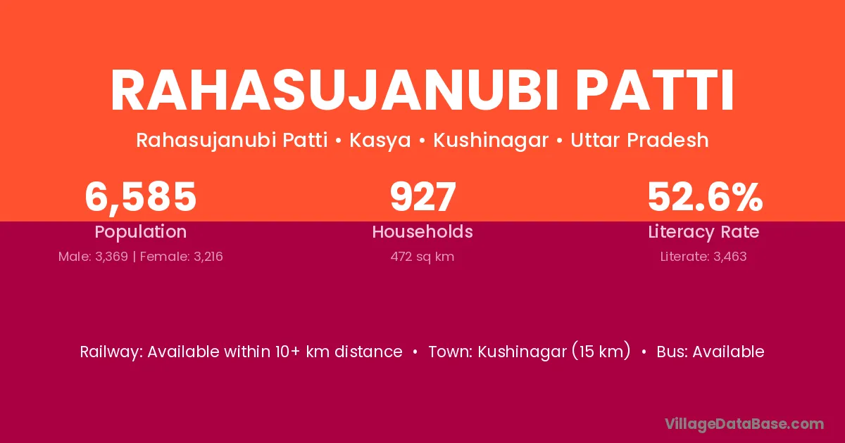 Rahasujanubi Patti village has a total population of 6,585 people, of which 3,369 are males and 3,216 are females.