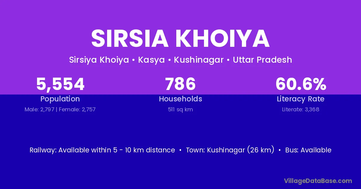 Kushinagar (26 km) is the nearest town to Sirsia Khoiya village for major economic activities and is located approximately 26 km away.