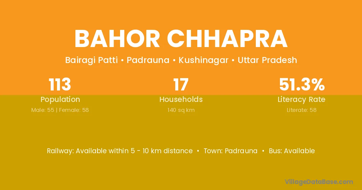 Bahor Chhapra village has a total population of 113 people, of which 55 are males and 58 are females.