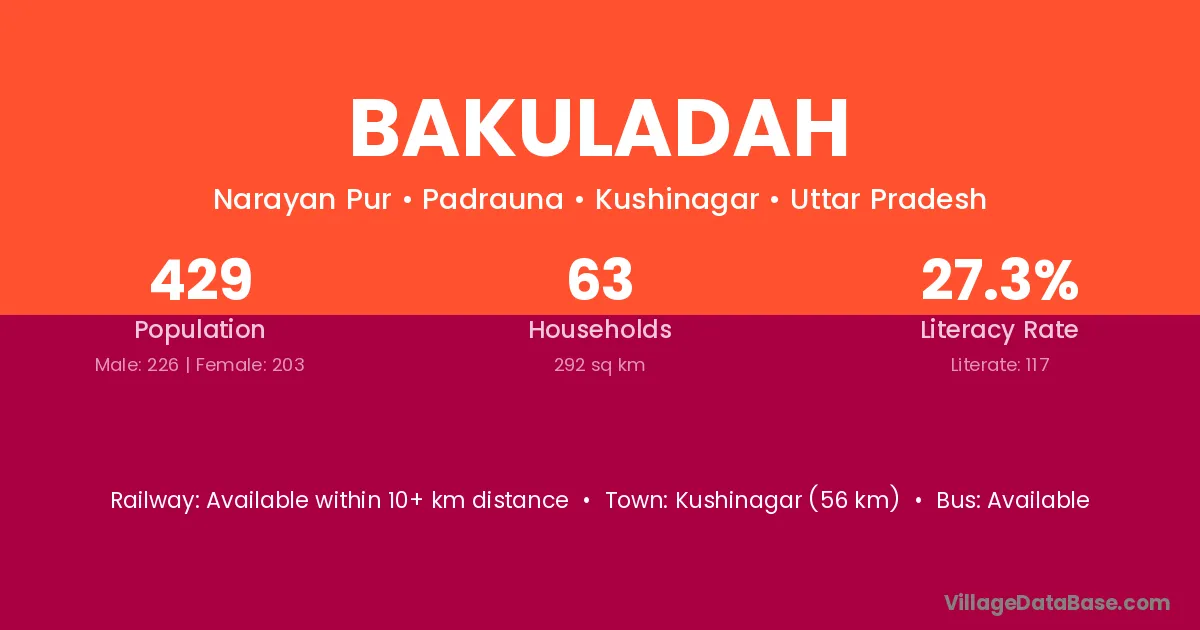 Kushinagar (56 km) is the nearest town to Bakuladah village for major economic activities and is located approximately 56 km away.