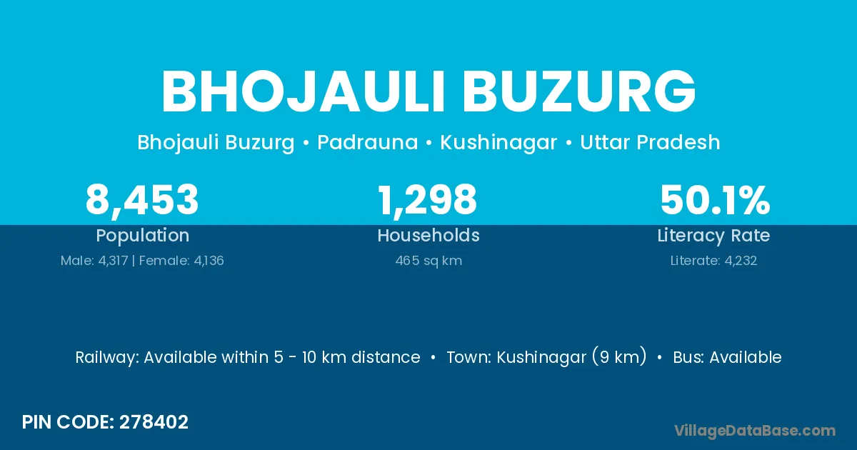 Kushinagar (9 km) is the nearest town to Bhojauli Buzurg village for major economic activities and is located approximately 9 km away.