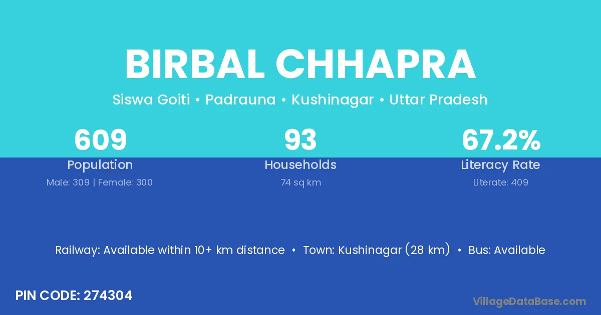 Kushinagar (28 km) is the nearest town to Birbal Chhapra village for major economic activities and is located approximately 28 km away.