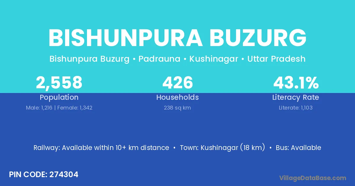 Kushinagar (18 km) is the nearest town to Bishunpura Buzurg village for major economic activities and is located approximately 18 km away.