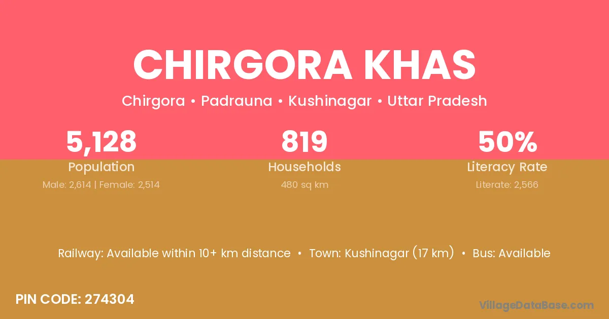 Kushinagar (17 km) is the nearest town to Chirgora Khas village for major economic activities and is located approximately 17 km away.