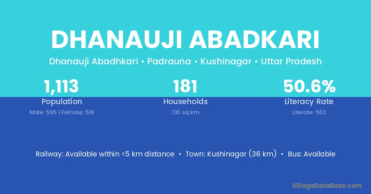 Kushinagar (36 km) is the nearest town to Dhanauji Abadkari village for major economic activities and is located approximately 36 km away.