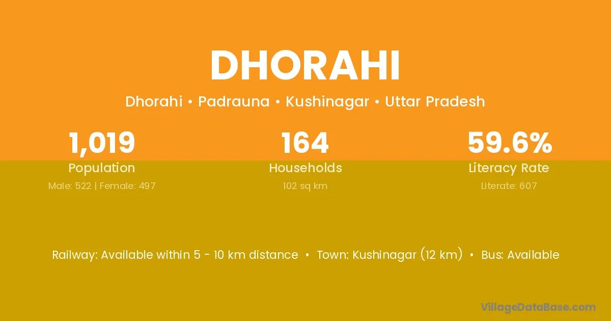 Kushinagar (12 km) is the nearest town to Dhorahi village for major economic activities and is located approximately 12 km away.