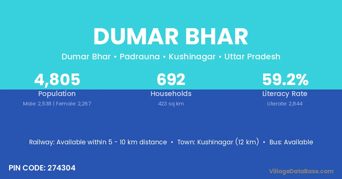 Kushinagar (12 km) is the nearest town to Dumar Bhar village for major economic activities and is located approximately 12 km away.