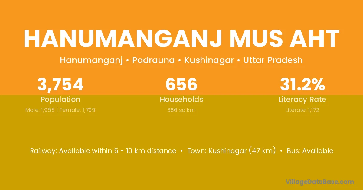 Kushinagar (47 km) is the nearest town to Hanumanganj Mus Aht village for major economic activities and is located approximately 47 km away.