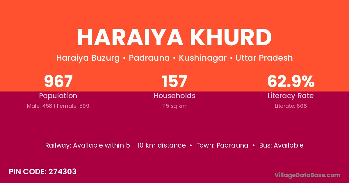 Haraiya Khurd village has a total population of 967 people, of which 458 are males and 509 are females.