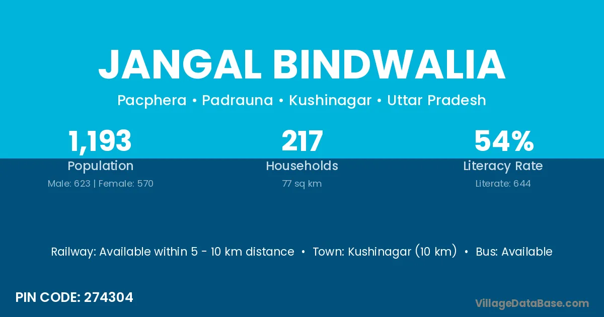 Kushinagar (10 km) is the nearest town to Jangal Bindwalia village for major economic activities and is located approximately 10 km away.