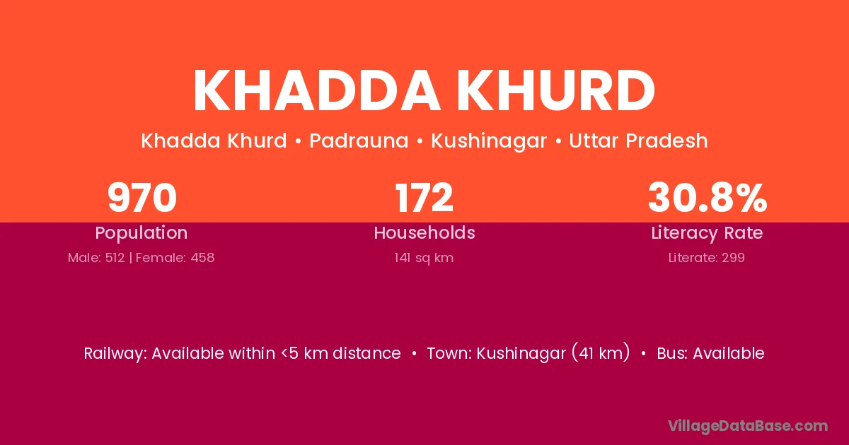 Kushinagar (41 km) is the nearest town to Khadda Khurd village for major economic activities and is located approximately 41 km away.