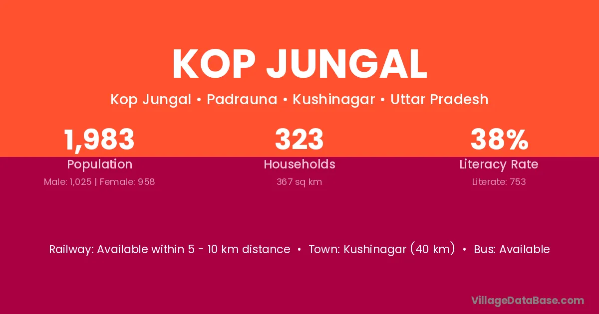 Kushinagar (40 km) is the nearest town to Kop Jungal village for major economic activities and is located approximately 40 km away.