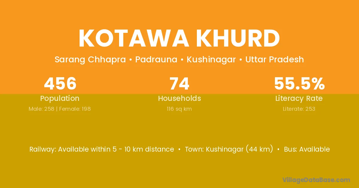 Kushinagar (44 km) is the nearest town to Kotawa Khurd village for major economic activities and is located approximately 44 km away.