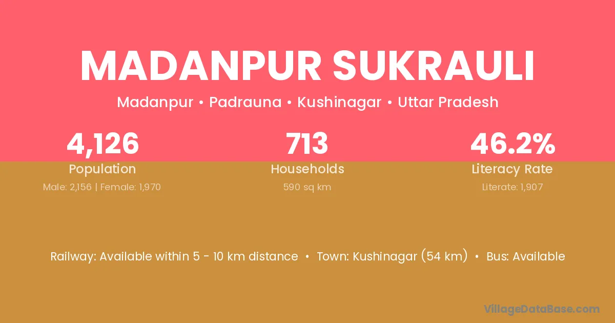Kushinagar (54 km) is the nearest town to Madanpur Sukrauli village for major economic activities and is located approximately 54 km away.