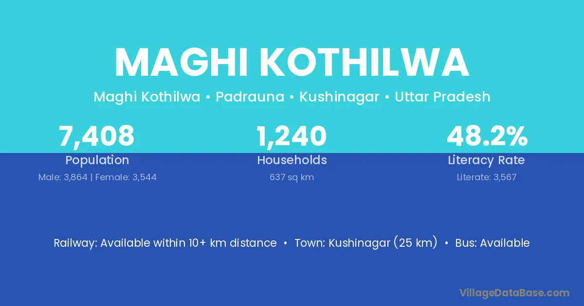 Kushinagar (25 km) is the nearest town to Maghi Kothilwa village for major economic activities and is located approximately 25 km away.