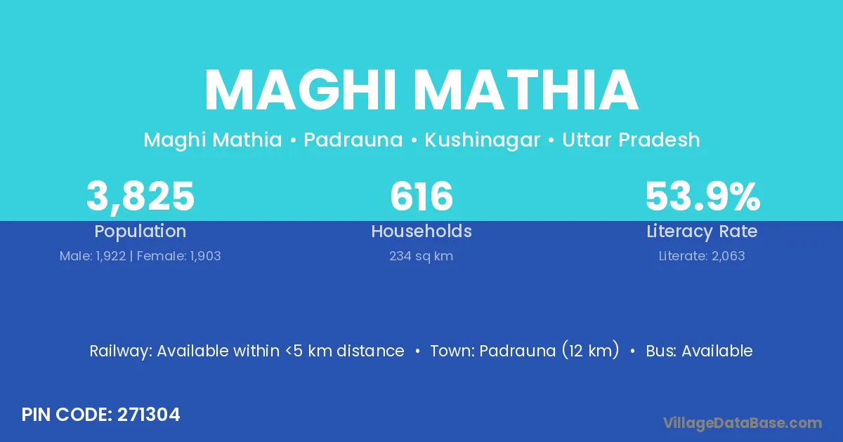 Padrauna (12 km) is the nearest town to Maghi Mathia village for major economic activities and is located approximately 12 km away.