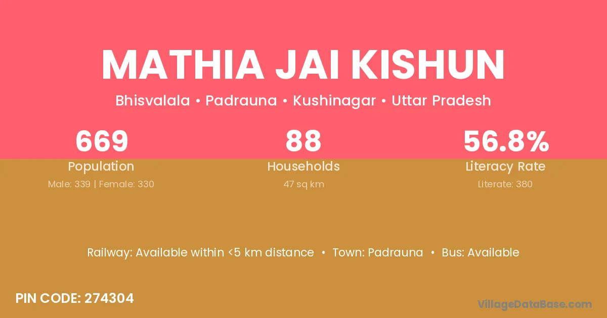 Mathia Jai Kishun village has a total population of 669 people, of which 339 are males and 330 are females.