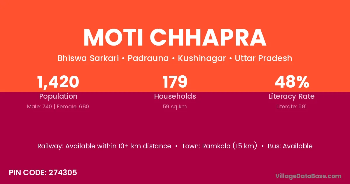 Ramkola (15 km) is the nearest town to Moti Chhapra village for major economic activities and is located approximately 15 km away.