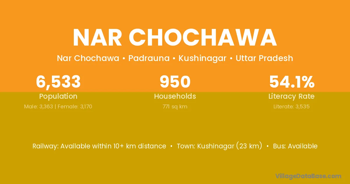 Kushinagar (23 km) is the nearest town to Nar Chochawa village for major economic activities and is located approximately 23 km away.