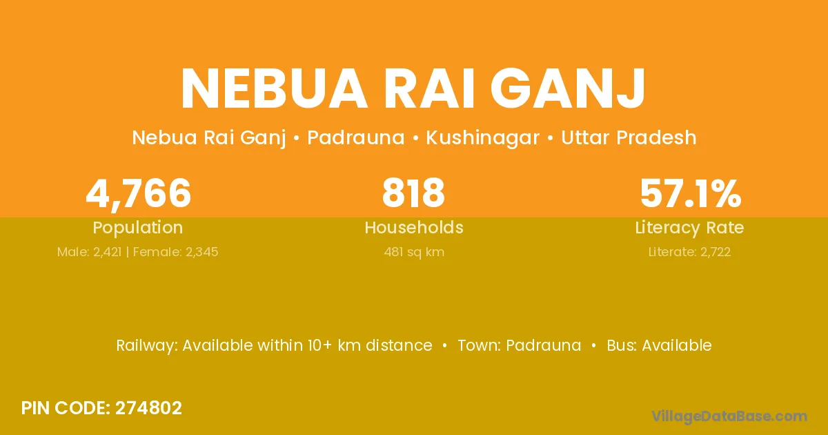 Nebua Rai Ganj village has a total population of 4,766 people, of which 2,421 are males and 2,345 are females.