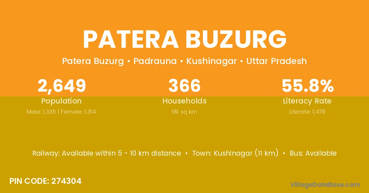 Kushinagar (11 km) is the nearest town to Patera Buzurg village for major economic activities and is located approximately 11 km away.